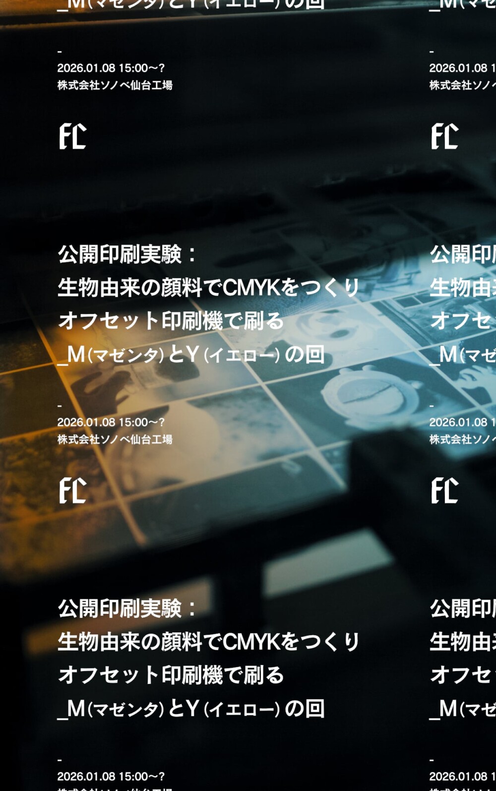 今回は今年度の集大成として、生物由来の顔料でCMYKを制作し、株式会社ソノベで製造に使われているオフセット印刷機を拝借し、実験を行ないます。同時に、あまり公にすることない実験空間を公開します。